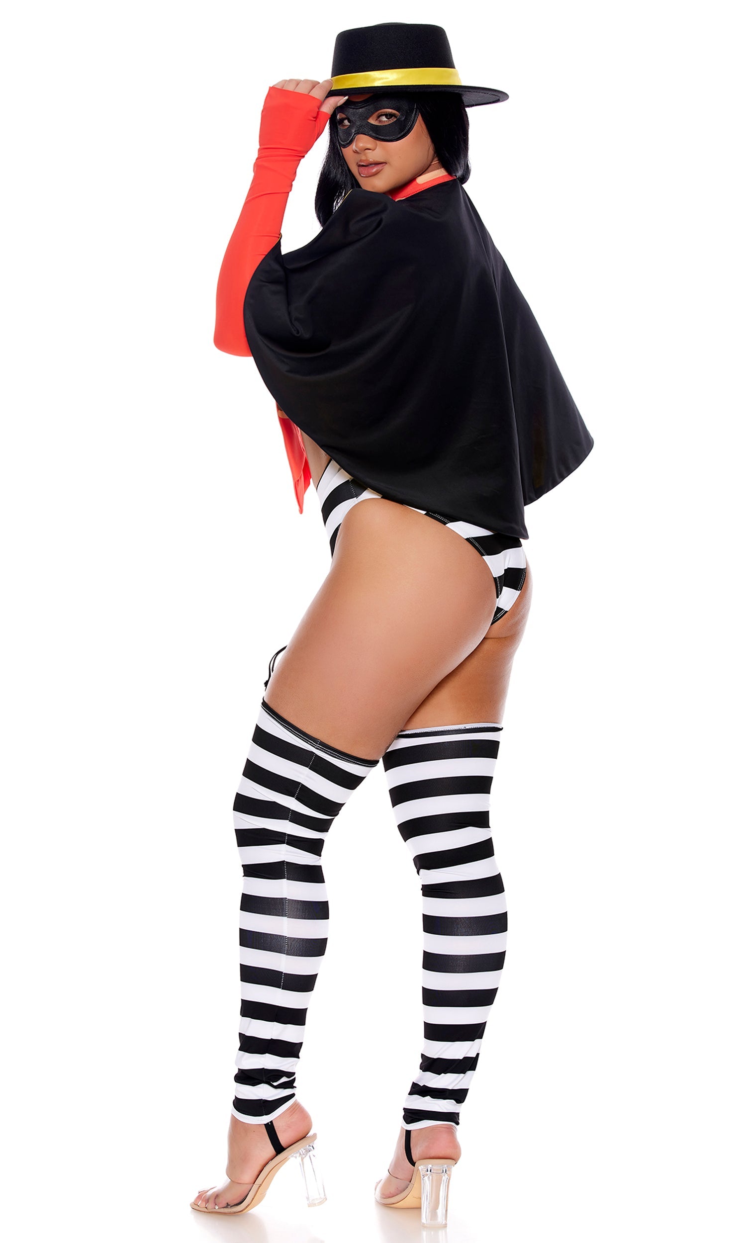 6-piece sexy character costume features striped bandeau top paired with matching high waisted panty with attached garter straps and contrast cropped cape with attached burger screenprint neck tie and fingerless opera length gloves and eye mask.\n\nWARNING: In accordance with CA Prop 65, this product may expose you to chemicals which are known to the State of California to cause cancer or reproductive harm.