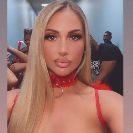 model is wearing professional Fishnet stockings PD801 light toast for a flawless skin look sold separately