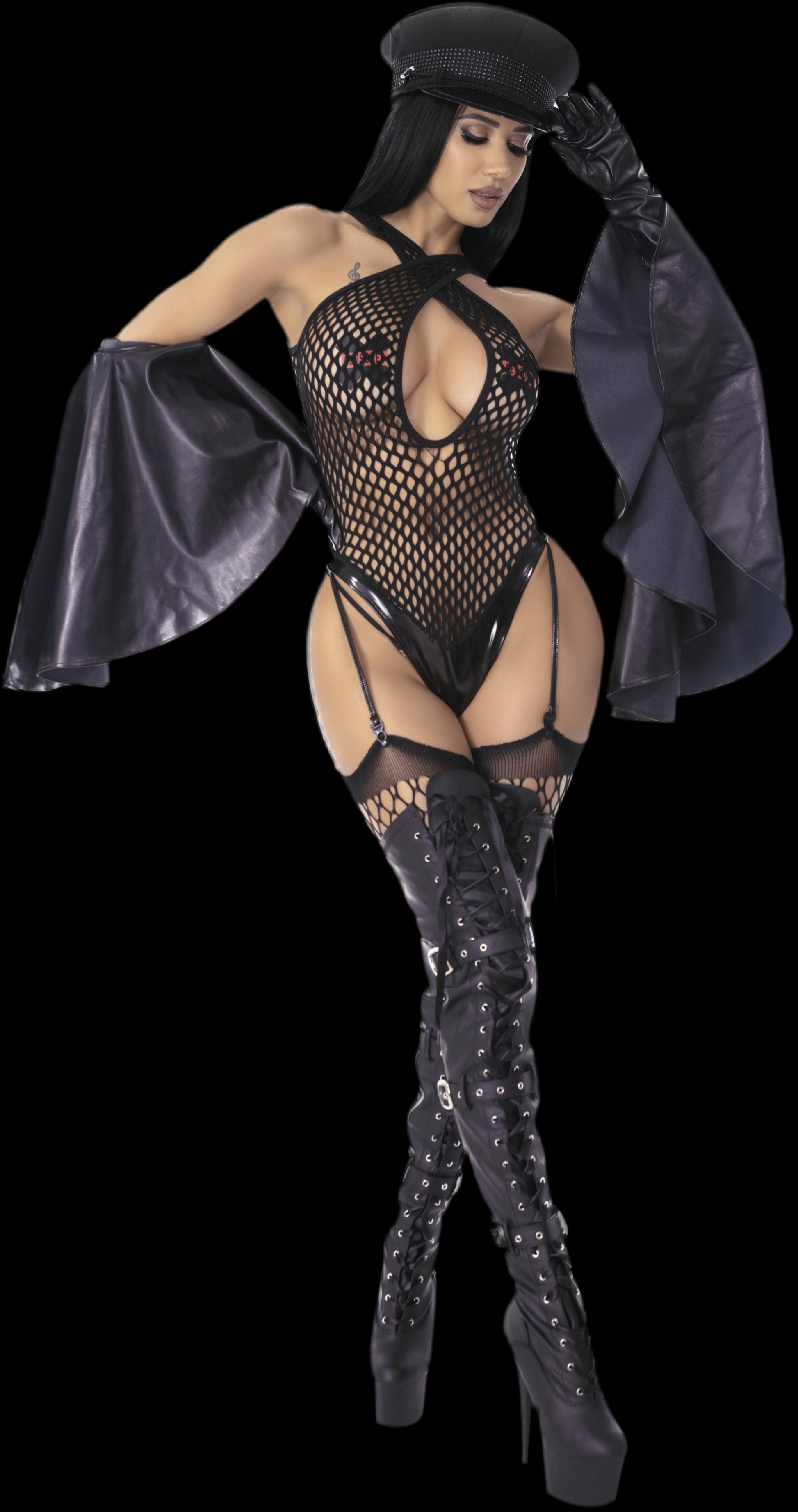 Get ready to strut your stuff in this one-of-a-kind bodysuit exclusively from Playthings! Featuring attached garters, wide net and vinyl fabric, this romper will turn heads and leave a lasting impression.
