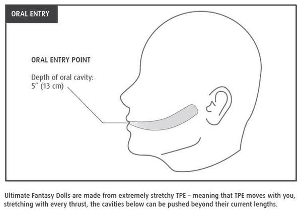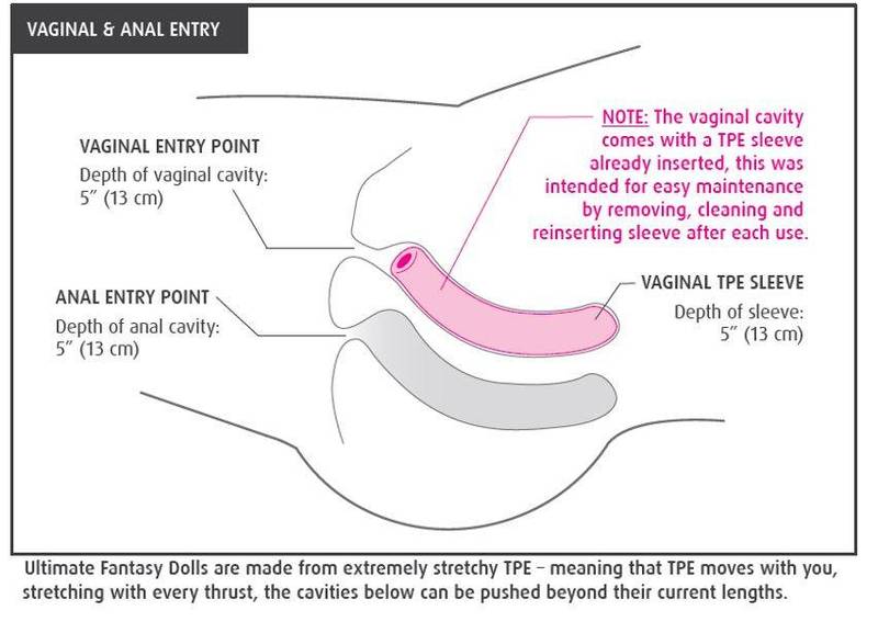 Ultimate Fantasy Dolls are made from extremely stretchy TPE - meaning that TPE moves with you, stretching with every movement, the cavities can be pushed beyond their current 5-inch lengths. Bella comes prepared with two (2) vaginal TPE sleeves for easy clean-up. Simply insert the sleeve with a little lubricant and enjoy. Should you choose to enjoy her other orifices, try using a condom for easy clean-up.
