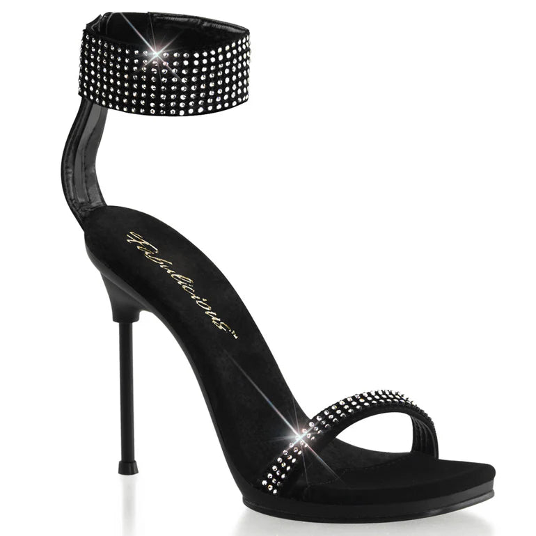4 1/2" (114mm) Stiletto Heel, 1/4" (6mm) Mini-Platform Sandal Featuring Rhinestone Embellishment on Thin Over-The-Toe Strap and Wide Ankle Cuff, Back Zip Closure