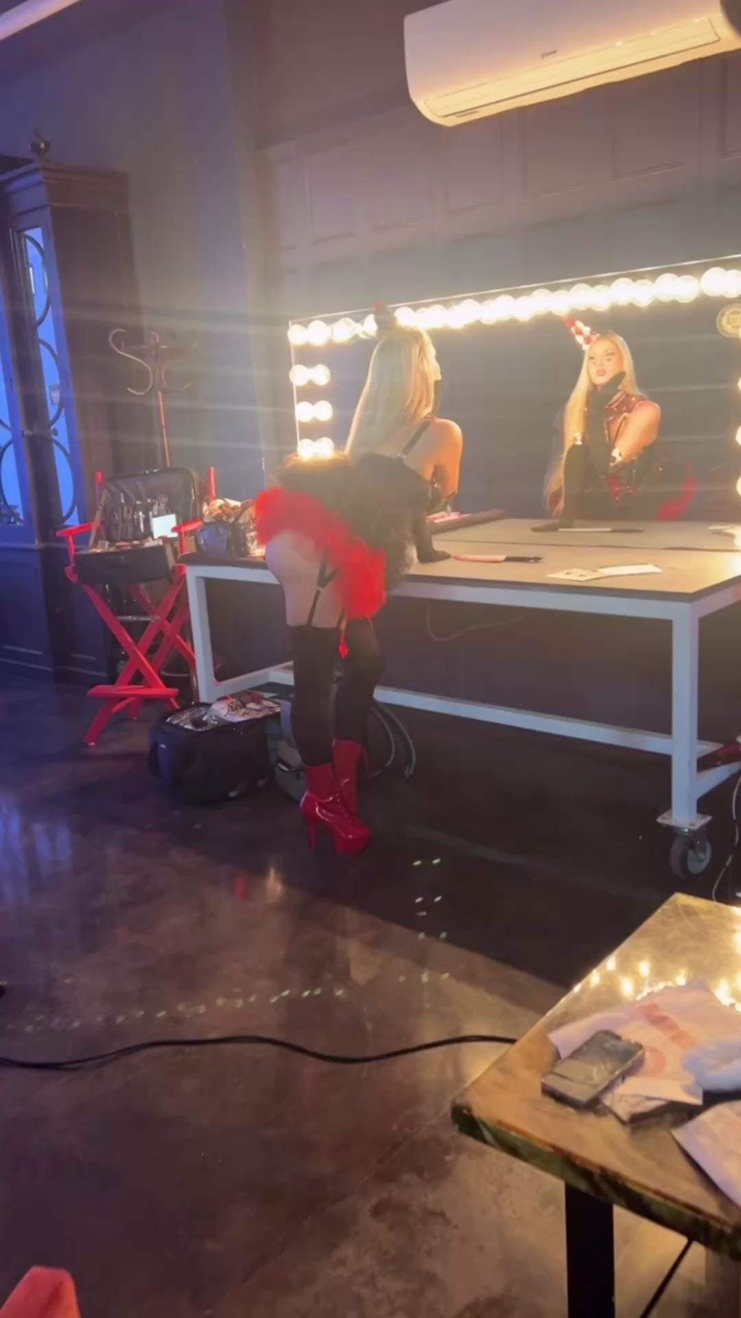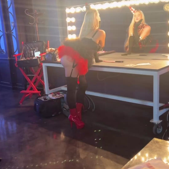 Killer Clown gold and red diamond print with black wet look spandex, tulle ruffle collar and waist with sequin trim. Hat, knife, thigh high stockings, tutus and gloves included.