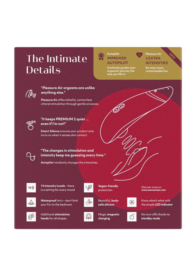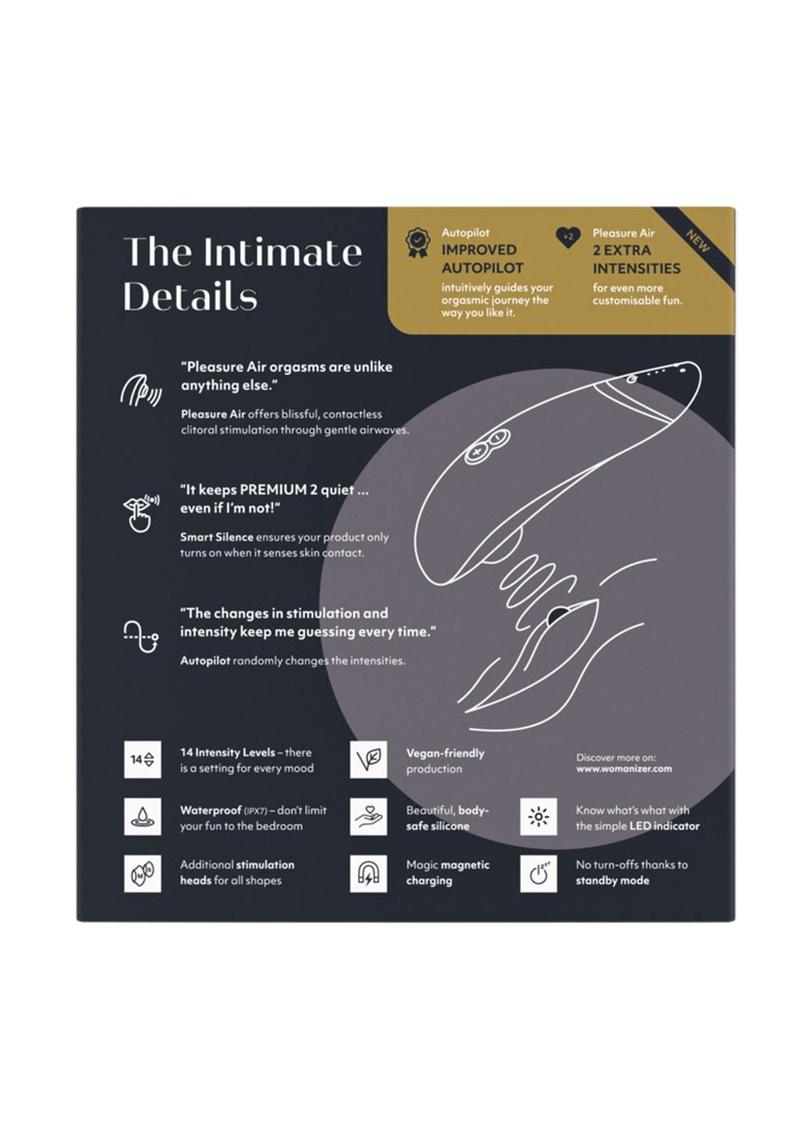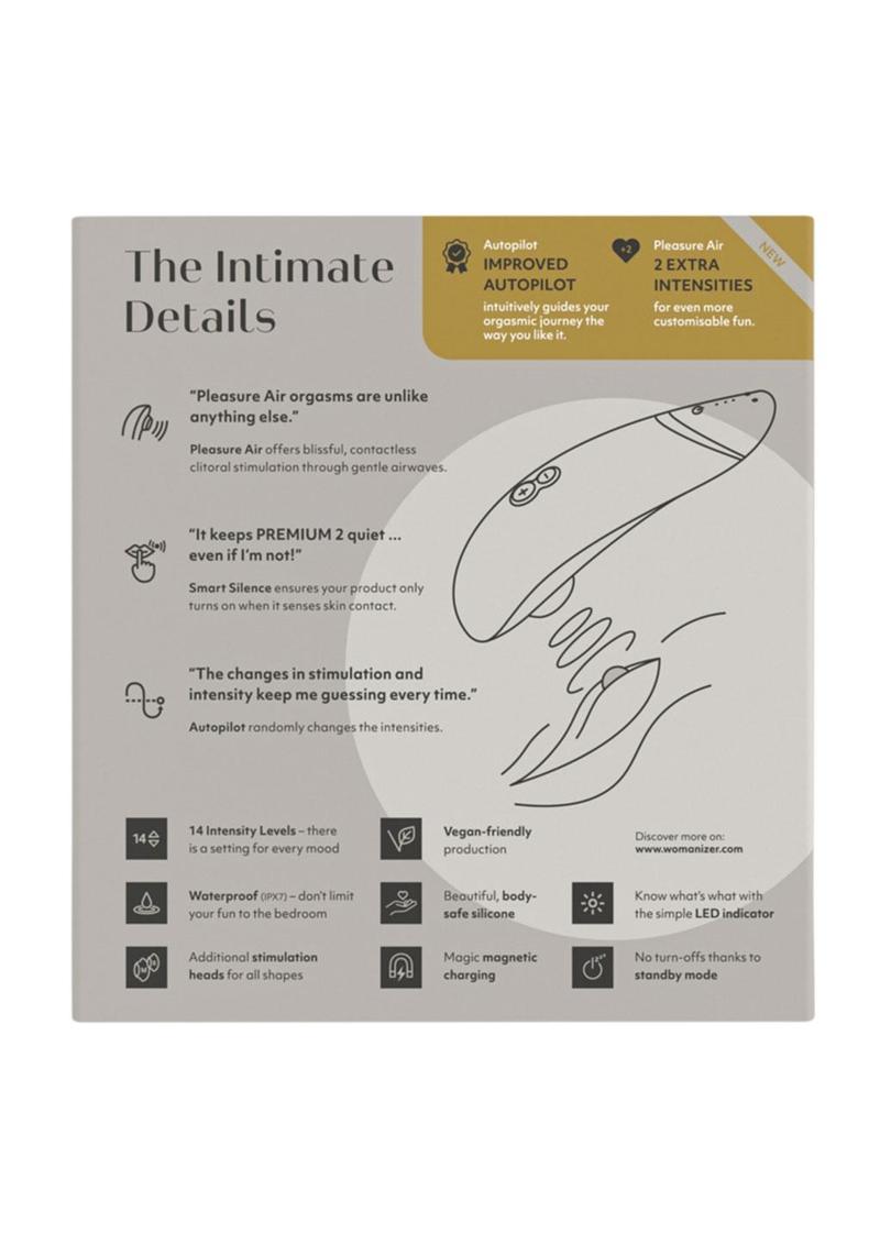 PREMIUM 2 is Womanizer's most luxurious toy yet, now with 14 intensity levels, discreet and innovative Smart Silence and an improved Autopilot feature for an indulgent, guided experience.